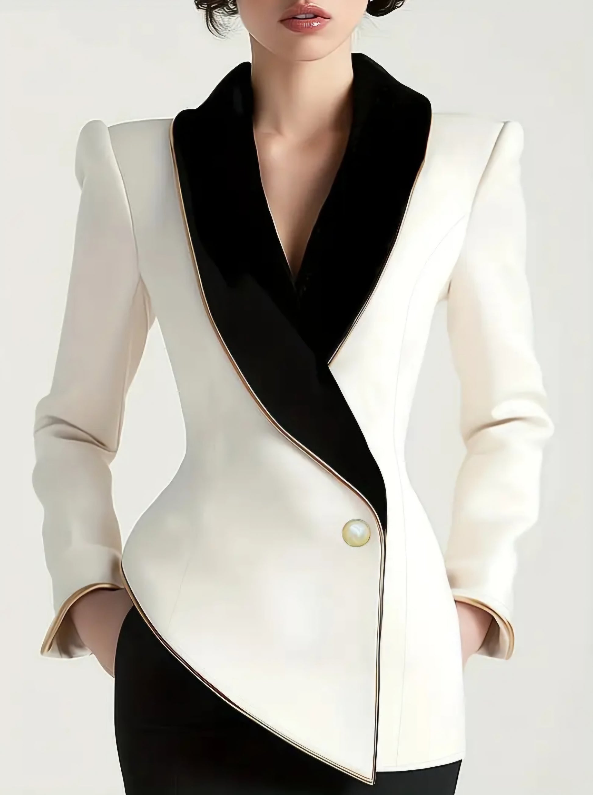 Elegant Asymmetrical Jacket Color-Block Suit Jacket Black & White Contrast with Golden Accents. Has an x-silhouette tailored fit and a structured design. It is machine Washable.